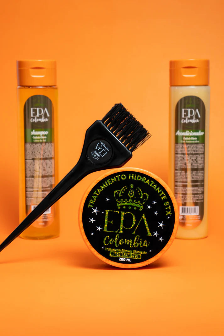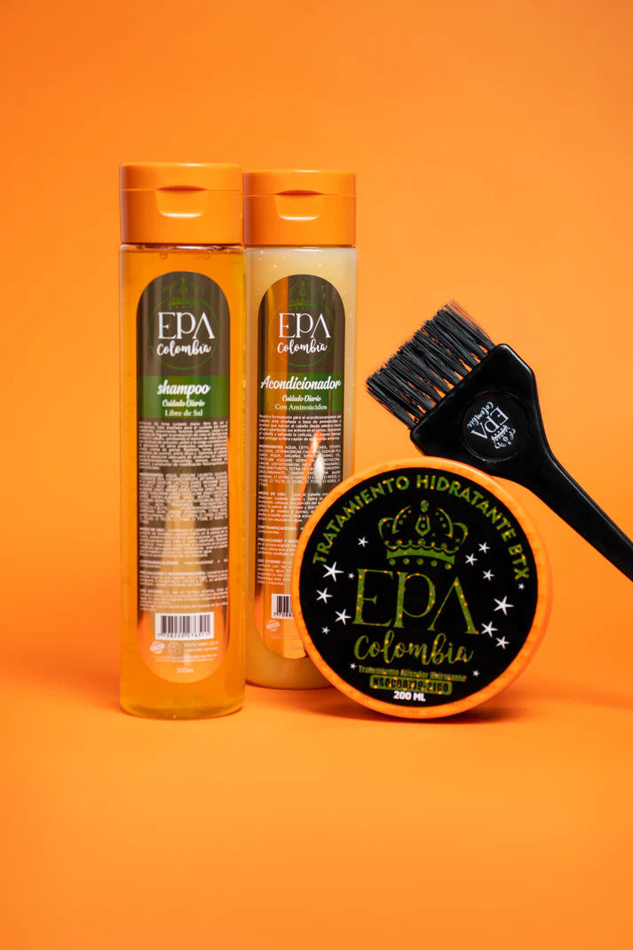 Incluye: 1 shampoo x 300ml + 1 acondicionador x 300ml + 1 porción x 200 ml de Tratamiento alisador (Hidratante BTX) + 1 brocha de aplicación.